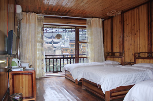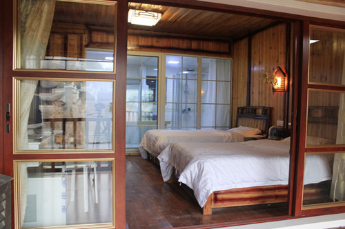 古樸的客房?jī)?nèi),超大陽(yáng)臺(tái)全景落地窗,是您欣賞沱江風(fēng)光帶首選客棧,兩座百年四合院內(nèi)小橋流水,假山錦鯉,一百三十平米休閑花園別具情調(diào)。紅酒加咖啡的大堂吧、彩色精致的情調(diào)房、古典高雅的臨江觀景房以及大型公共觀景平臺(tái),龍閣的點(diǎn)點(diǎn)滴滴都透著出古城的神韻和幽靜,走進(jìn)龍閣客棧,給您一個(gè)完美的鳳凰古城沱江全景!
