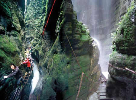 坐龍峽圖片 坐龍峽風(fēng)景區(qū)位于古丈縣河西鎮(zhèn),與“芙蓉鎮(zhèn)”--王村一水之隔。經(jīng)由300萬(wàn)年大自然的風(fēng)吹、水蝕而成,一直隱逸于湘西茫茫十萬(wàn)群山之中。它長(zhǎng)約3500米,最大高差達(dá)300余米;寬處不足丈余,窄處僅容一人通過(guò);谷內(nèi)絕壁縱疊,溪瀑橫懸,崖樹(shù)斜逸,異草遍坡。