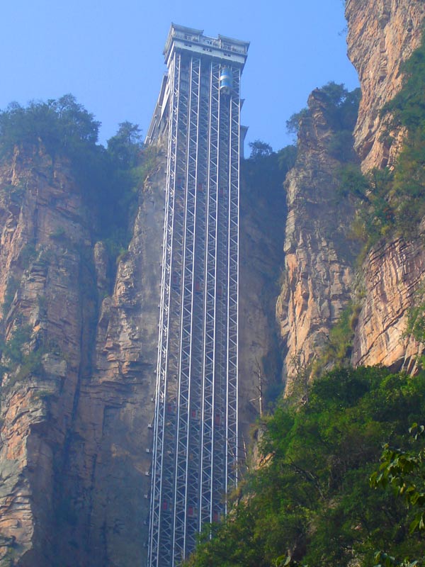 百龍?zhí)焯,垂直高?35米,運行高度326米,由154米山體內(nèi)堅井和172米貼山鋼結(jié)構(gòu)井架等組成,采用三臺雙層全暴露觀光電梯并列分體運行,每臺次載客50人次,運行速度3米/秒,三臺同時運行每小時往返量達4000人次。百龍?zhí)焯莸男藿▽崿F(xiàn)“山上游,山下住”的目標,提供了交通保障,將袁家界天下第一橋、迷魂臺、天懸白練以及烏龍寨、楊家界等絕世美景從幕后推向了前臺,并將天子山、袁家界、金鞭溪等精品旅游線路連為一體,解決了多年困擾景區(qū)的交通瓶頸問題。