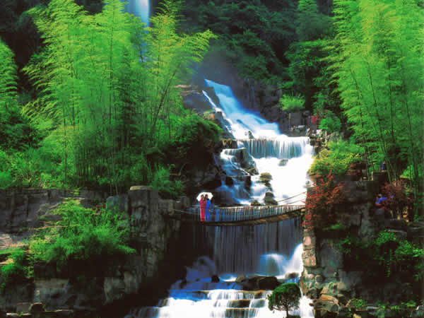 寶峰湖瀑布 湖中有兩座疊翠小島,近岸奇峰屹立,峰回水轉(zhuǎn)。泛舟漫游,只見一湖綠水半湖倒影,充滿詩情畫意!霸铺萑f丈上天臺,高峽平湖一鑒開,王母瑤池金扶,浣沙仙女下凡來”游寶峰湖,你就會欣賞到這樣的詩情畫意。群峰擁抱的寶峰湖,長約2.,5公里,湖猶如一面寶鏡,四面青山,一泓碧水,蕩槳溫游,格外愜意。坐在船上,環(huán)顧四周,千山聳翠,俯視水中,倒影慢移,碧水照相館得群峰綠,人面桃花水映紅。真是靜極了,美極了!韓劇《九天洞》拍攝的湖水就是寶峰湖。