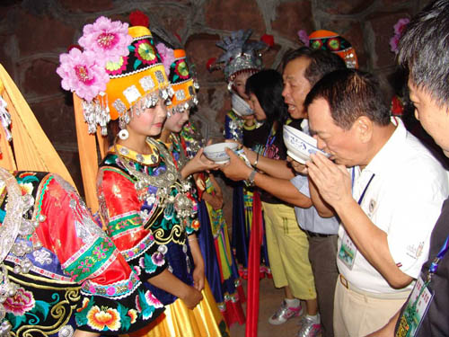 祝賀詞和答謝詞之后,主人把早已想好了的農(nóng)事或家事其日常生活的要事向來(lái)客提問,接謝人隨問隨答,然后由族長(zhǎng)十分恭敬地雙手舉起盛滿包谷酒的酒杯,遞給一個(gè)年長(zhǎng)客人,一碗一碗地讓客人們喝下這香醇美的包谷燒酒。一切儀式做完之后,說聲:“得罪了,最尊貴的客人”,客人答一聲“請(qǐng)不要客氣,我們都是一家人”。這時(shí),酒門大開,攔門人很禮貌地讓開一條道路恭迎客人進(jìn)屋。