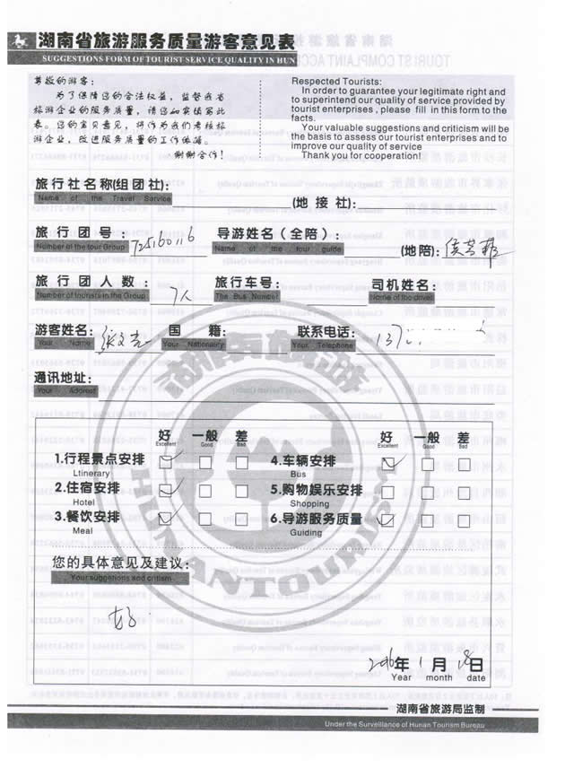 1月份,長(zhǎng)沙張女士一行7位貴賓與湖南西部(張家界)中國(guó)國(guó)際旅行社工作人員——張群取得聯(lián)系,經(jīng)過(guò)商談,雙方達(dá)成協(xié)議并簽訂旅游合同,于1月16日抵達(dá)張家界,開(kāi)始張家界之旅。此次行程是由我社優(yōu)秀導(dǎo)游——侯芳菲負(fù)責(zé)旅游接待工作,侯在旅游過(guò)程中講解詳細(xì),客人也很滿(mǎn)意。同時(shí)也感謝張女士一行貴賓選擇湖南西部(張家界)中國(guó)國(guó)際旅行社,以及您對(duì)湖南西部國(guó)旅的信任與支持。我們會(huì)繼續(xù)努力,做好旅游接待工作。期待下一次與您的合作,祝您愉快!